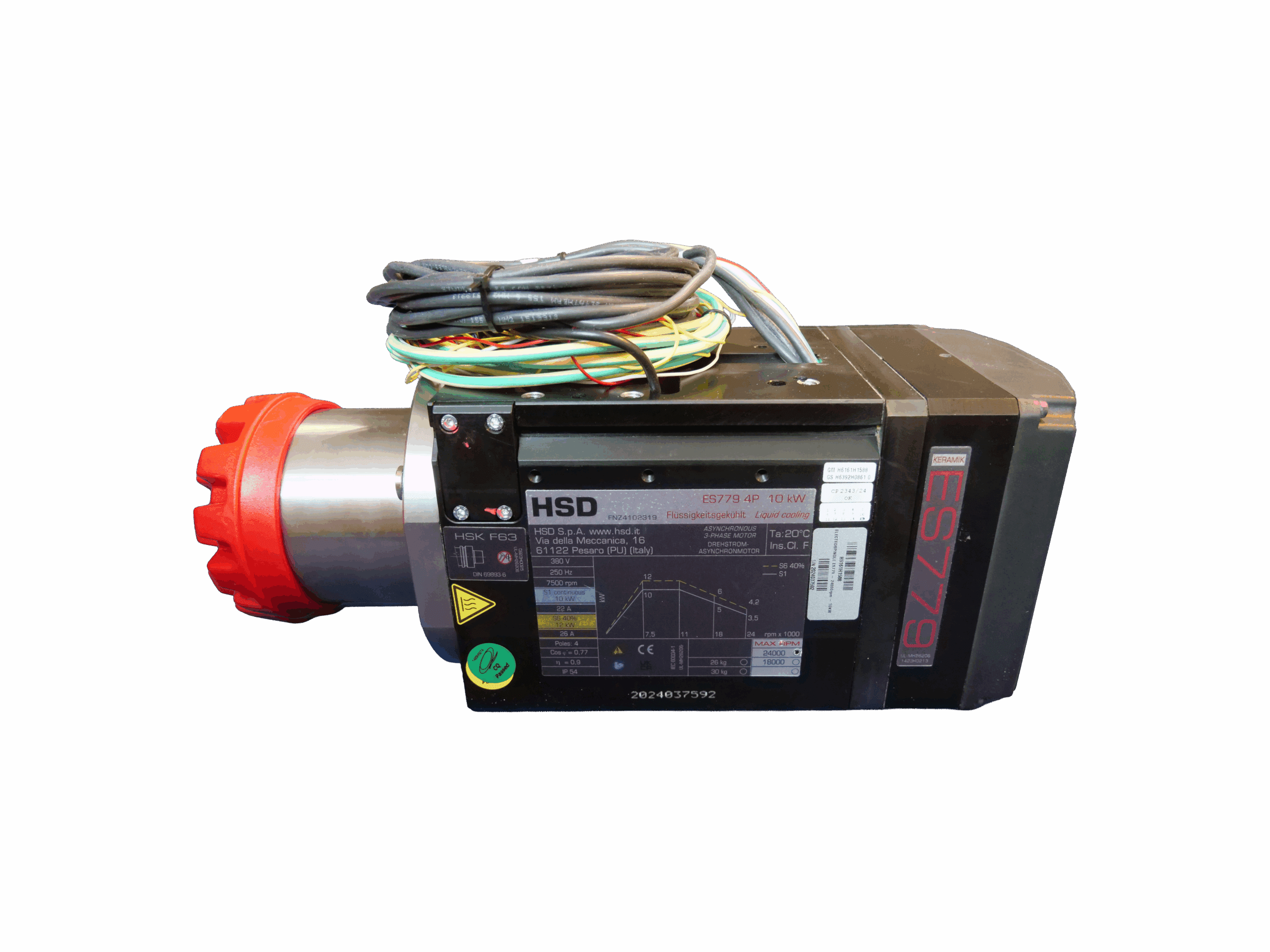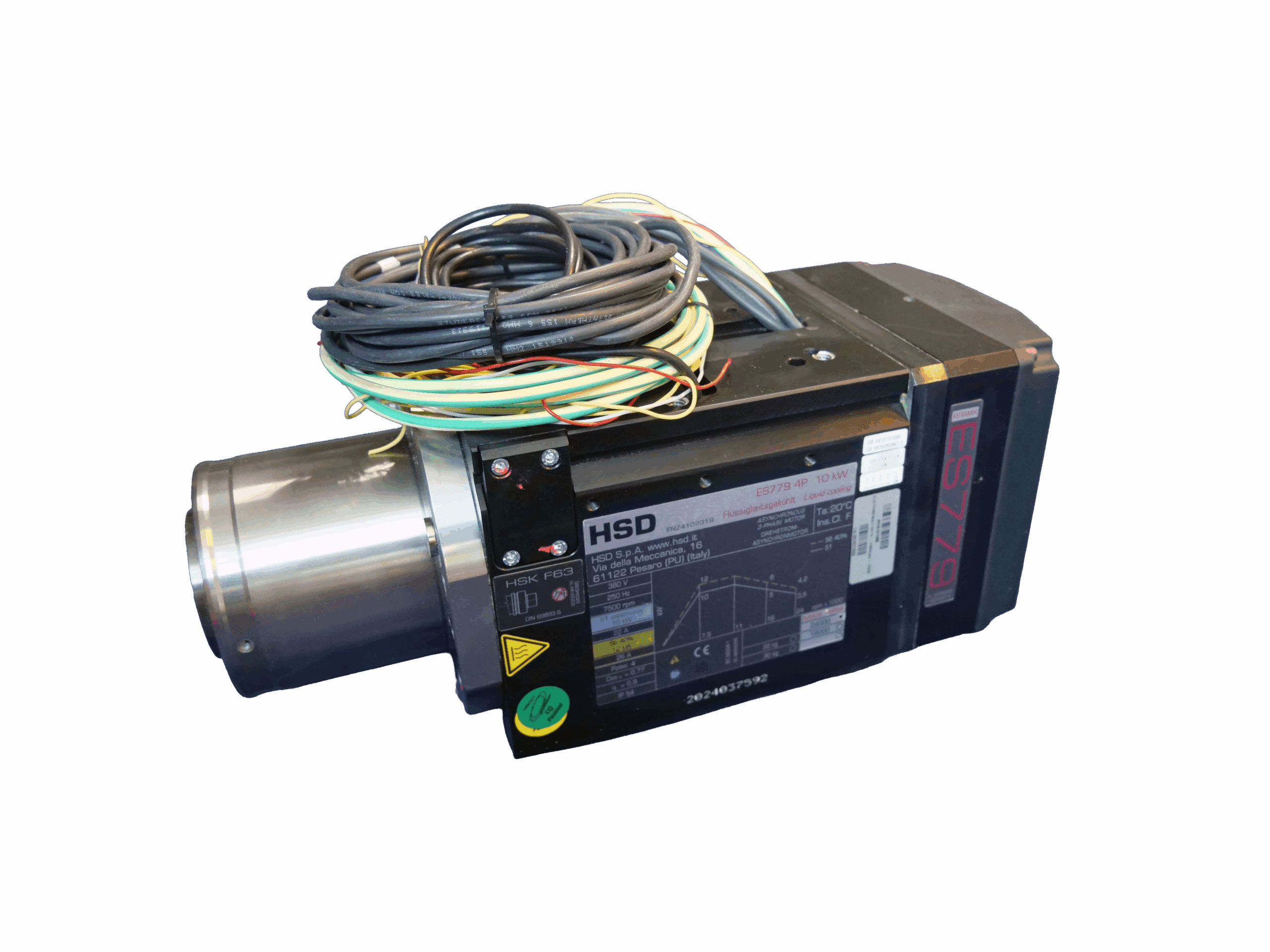 The ES779 HSK F63 spindle delivers exceptional cutting accuracy and consistency for demanding industrial CNC machines. Operating at 380 V with a 4-pole asynchronous motor, it provides 10 kW continuous (S1) and 12 kW intermittent (S6) power output. Its liquid-cooling system maintains optimal operating temperatures even during extended high-speed use, while the ceramic bearing design ensures reduced vibration and extended service life.