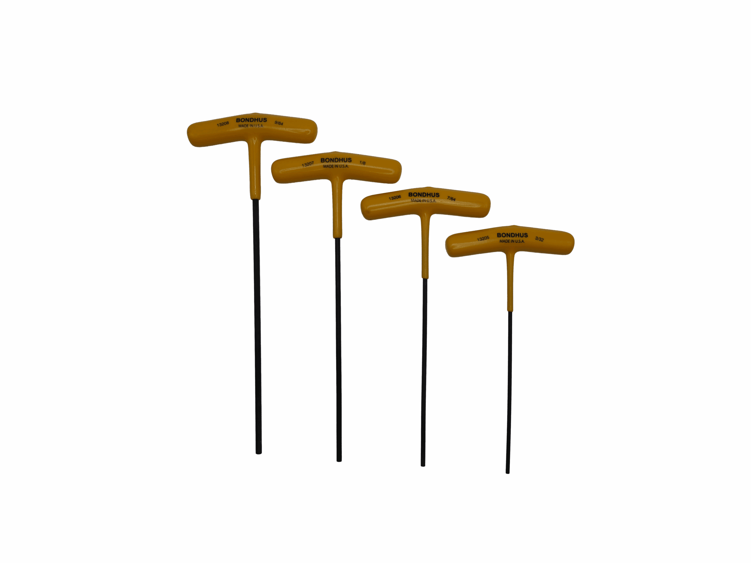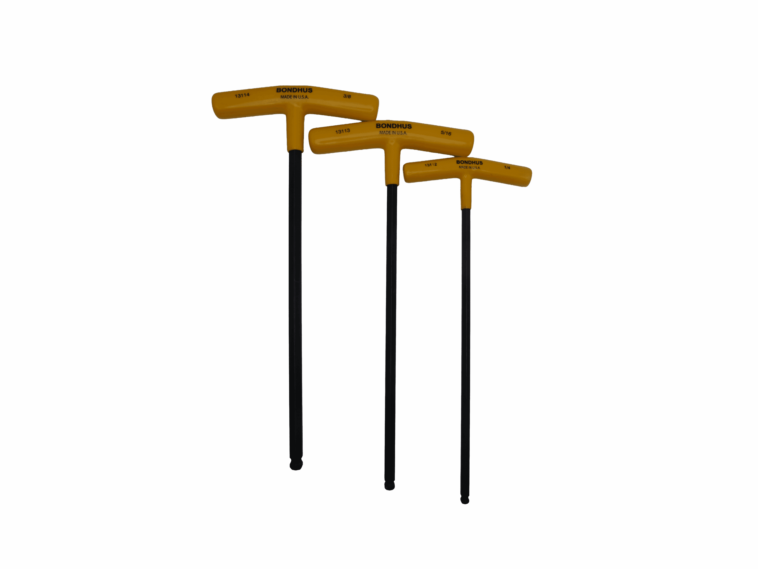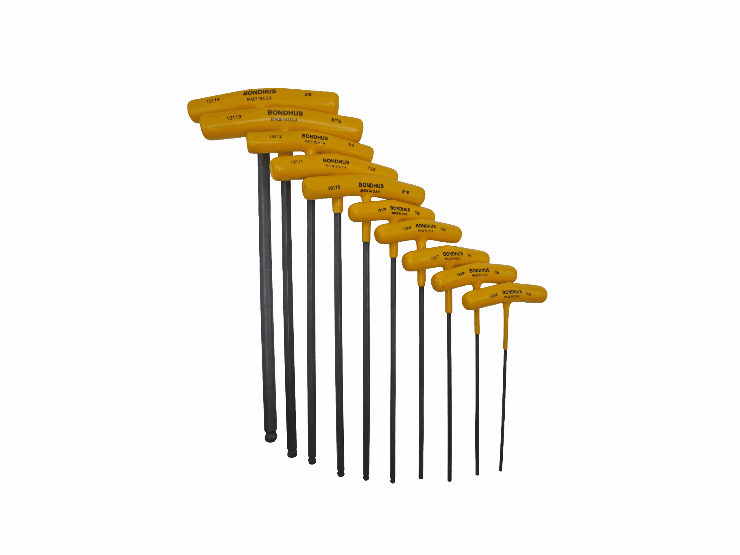 Bondhus 10-piece SAE T-handle hex key set, model 13138. Includes 3/32 to 3/8 inch sizes with ball-end tips for angled fastener entry. Built from Protanium® high-torque steel for superior durability. Ideal for CNC service, industrial maintenance, and general mechanical work. Made in the USA.