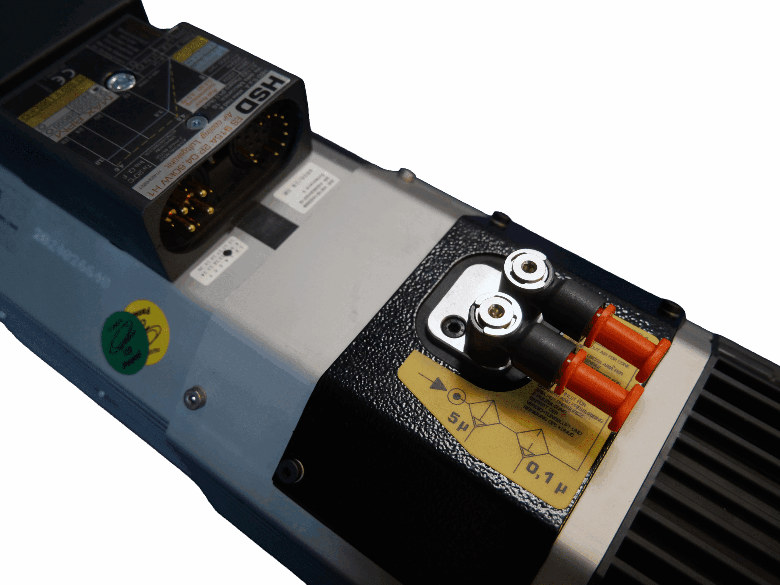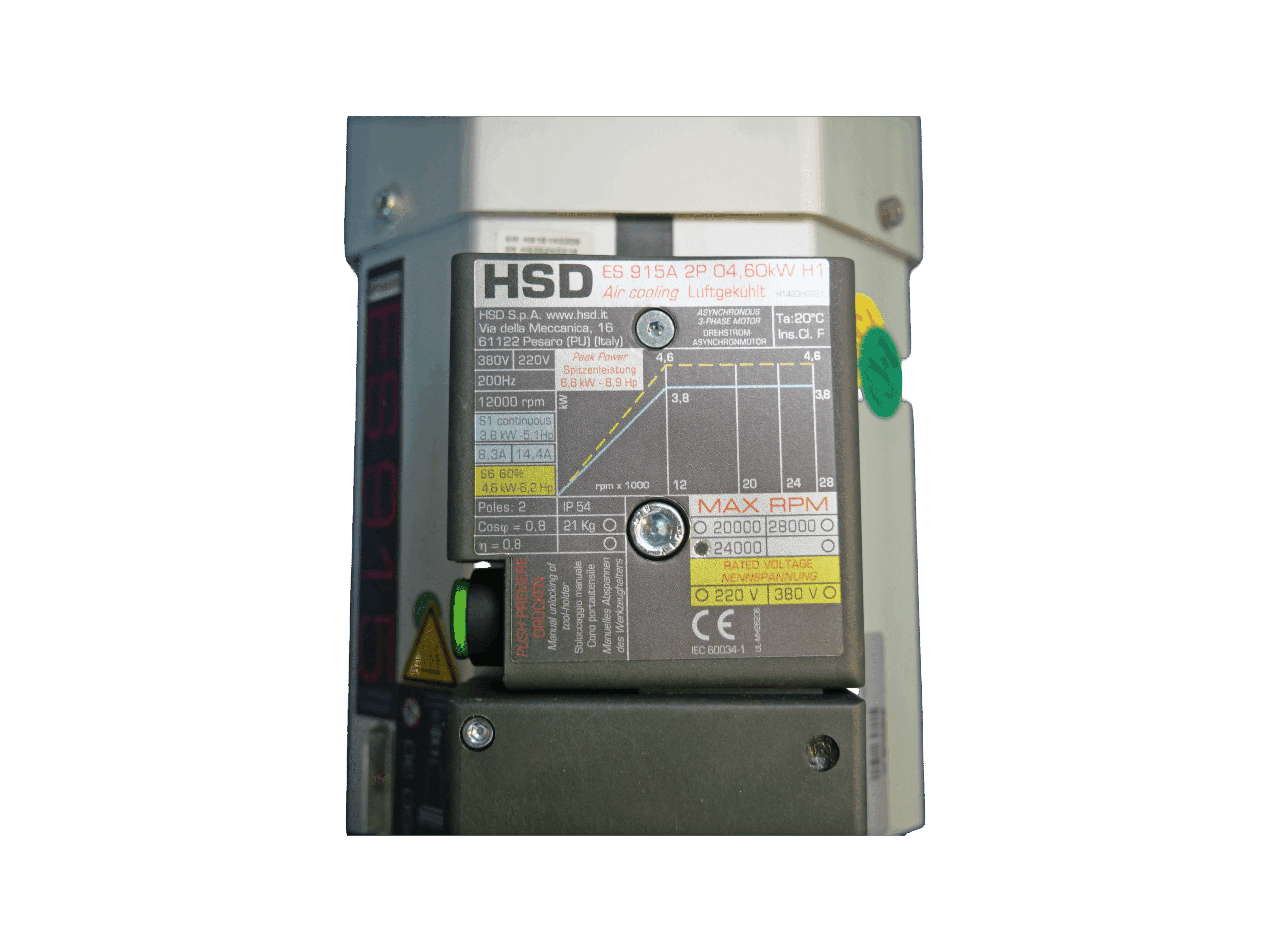 The HSD ES915 ISO 30 spindle is a compact, high-efficiency motor built for industrial CNC routers and milling machines requiring air-cooled operation and stable output. With a continuous rating of 3.8 kW (S1) and peak output up to 4.6 kW (S6), this 2-pole asynchronous motor delivers smooth power across a wide speed range up to 24 000 RPM.